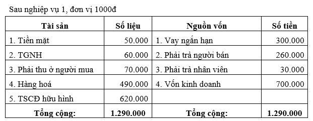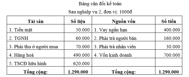 VD2: Vay ngắn hạn ngân hàng trả nợ người bán 100.000. Nghiệp vụ kinh tế phát sinh làm cho khoản vay ngắn hạn tăng 100.000, sau nghiệp vụ kinh tế số dư tiền vay ngắn hạn là 400.000, đồng thời khoản phải trả người bán giảm 100.000, sau nghiệp vụ kinh tế phát sinh số dư công nợ người bán là 160.000 tổng số tiền bên tài sản và nguồn vốn không thay đổi.