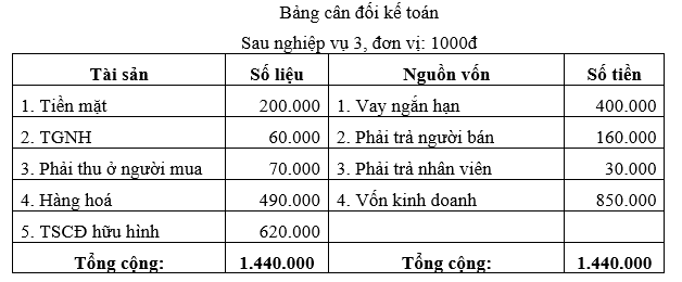 VD3: Nhận vốn kinh doanh bằng tiền mặt 150.000 nhập quỹ: Nghiệp vụ kinh tế phát sinh làm vốn kinh doanh tăng 150.000, sau nghiệp vụ kinh tế này vốn kinh doanh có số dư 850.000, đồng thời tiền mặt tăng 150.000, sau nghiệp vụ kinh tế này số dư tiền mặt là 200.000 tổng số tiền phần tài sản tăng 150.000 thành 1.440.000 tổng số tiền phần nguồn vốn tăng 150.000 thành 1.440.000.