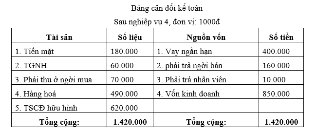 - Trường hợp 4: Nghiệp vụ kinh tế phát sinh làm cho một khoản tải sản giảm và một khoản nguồn vốn giảm tương ứng.