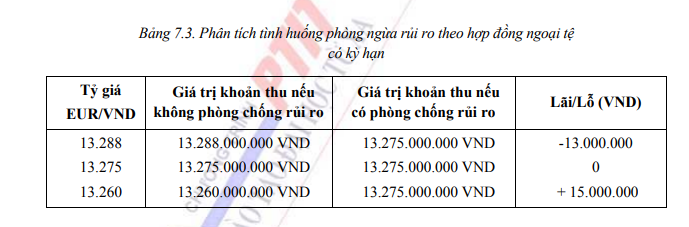 Ví dụ 2: Công ty A có khoản thu 1 triệu EUR trong vòng 06 tháng nữa. Tỷ giá giao ngay 1EUR = 13.288 VND. Công ty sợ rằng EUR có thể xuống giá trong những ngày tới. Do đó, công ty A sẽ bán 12 triệu EUR theo hợp đồng có kỳ hạn 06 tháng với tỷ giá có kỳ hạn 06 tháng: 1 EUR = 13.275 VND.
