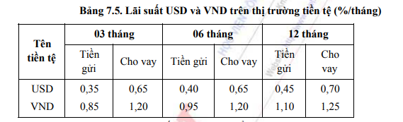Trước hết, thăm dò xem lãi suất USD và VND trên thị trường tiền tệ như thế nào? Ví dụ lãi suất tiền gửi và cho vay như sau: