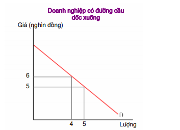 Trong trường hợp doanh nghiệp có đường cầu dốc xuống, doanh nghiệp giảm giá sẽ làm tăng lượng cầu. Doanh thu biên, trong trường hợp này, sẽ thấp hơn giá. Chúng ta hãy xem xét tại sao có điều này với tình huống mô tả trong biểu đồ dưới đây. Khi giá 6 nghìn đồng, doanh nghiệp có thể bán được 4 đơn vị và doanh thu sẽ bằng 6 nghìn đồng x 4 = 24 nghìn đồng. Nếu doanh nghiệp muốn bán thêm đơn vị thứ 5, giá bán sẽ thấp hơn và bằng 5 nghìn đồng. Tổng doanh thu lúc này là 25 nghìn đồng. Doanh thu biên trong trường hợp này được xác định bằng thay đổi doanh thu / thay đổi sản lượng = 1 nghìn đồng / 1 = 1 nghìn đồng. Như ví dụ này minh họa, doanh thu biên luôn luôn nhỏ hơn giá khi đường cầu dốc xuống. Mức giá thấp hơn không chỉ đối với đơn vị sau cùng mà đối với các cả các đơn vị sản lượng bán. Trong trường hợp này, doanh nghiệp nhận 5 nghìn đồng cho đơn vị bán sau cùng, nhưng mất 4 nghìn đồng doanh thu do giá giảm 1 nghìn đồng cho 4 đơn vị sản lượng đầu tiên. Vì vậy, doanh thu chỉ tăng thêm 1 nghìn đồng khi đơn vị sản lượng thứ 5 bán ra.