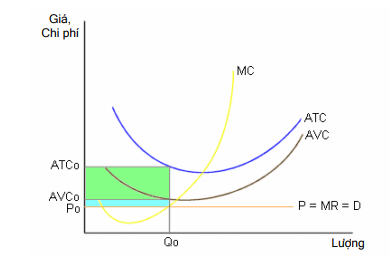 Nếu giá thấp hơn AVC thì doanh nghiệp sẽ đóng cửa và được minh họa thông qua biểu đồ dưới đây. Phần diện tích tô đậm (với chiều cao giới hạn bởi ATCo và AVCo) bằng với chi phí cố định của doanh nghiệp (phần lỗ khi doanh nghiệp đóng cửa). Tuy nhiên, nếu doanh nghiệp vẫn tiếp tục sản xuất thì doanh nghiệp sẽ lỗ nhiều hơn, không chỉ mất toàn bộ chi phí cố định mà còn lỗ do giá thấp hơn AVC (tương ứng với phần tô đậm của diện tích giới hạn bởi chiều cao giữa AVCo và Po. Như minh họa dưới đây, doanh nghiệp sẽ lỗ ít hơn nếu ngừng sản xuất khi P < AVC.