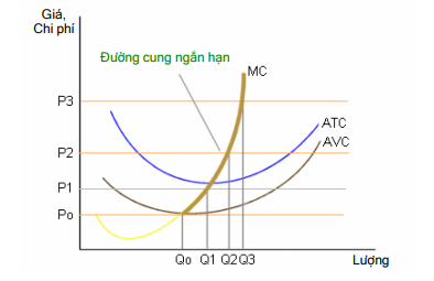 Cho đến bây giờ, chúng ta quan sát thấy doanh nghiệp cạnh tranh hoàn hảo sẽ sản xuất tại mức giá P = MC, miễn là P > AVC. Biểu đồ dưới đây chỉ ra các mức giá P0, P1, P2 và P3 tưong ứng với các mức sản lượng Q0, Q1, Q2 và Q3. Như vậy, đường MC xác định mức sản lượng sản xuất của doanh nghiệp miễn là P > AVC. Phần MC nằm phía trên AVC min chỉ ra lượng cung theo các mức giá, đó chính là đường cung ngắn hạn của doanh nghiệp. Đường cung được minh họa bởi phần MC nằm phía trên AVCmin tô đậm dưới đây.