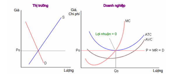 Biểu đồ trên minh họa cân bằng dài hạn của doanh nghiệp cạnh tranh hoàn hảo, giá bằng với chi phí biên (MC), doanh nghiệp sẽ tối đa hóa lợi nhuận. Giá cũng bằng với chi phí trung bình (ATCmin), vì vậy lợi nhuận bằng không. Các doanh nghiệp mới không có động lực để gia nhập vào thị trường, cũng như các doanh nghiệp hiện tại không có động lực để rút khỏi thị trường.