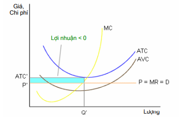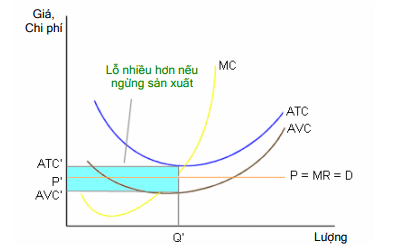 Điều này có ý nghĩa gì trong thực tiễn, thực tế một doanh nghiệp sẽ tiếp tục sản xuất nếu giá lớn hơn chi phí biến đổi trung bình. Doanh nghiệp sẽ đóng cửa (ngừng sản xuất) khi giá nhỏ hơn chi phí biến đổi trung bình. Chúng ta sẽ xem xét tình huống này trong biểu đồ dưới đây. Trong trường hợp này, mặt dù doanh nghiệp lỗ, nhưng mức lỗ sẽ tối thiểu tại mức sản lượng mà MR = MC. Điều này xảy ra tại mức sản lượng Q’. Do chi phí trung bình (ATC’) lớn hơn giá (P’), doanh nghiệp sẽ bị lỗ. Tuy nhiên, giá vẫn còn lớn hơn AVC cho nên doanh nghiệp vẫn tiếp tục sản xuất.