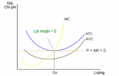 Nếu giá thị trường bằng với điểm cực tiểu của đường ATC thì lợi nhuận của doanh nghiệp bằng không (giá hoà vốn). Trong trường hợp này, doanh nghiệp sẽ nhận được một tỷ suất thu nhập trên đầu tư bằng với tỷ suất đầu tư của các ngành khác. Thực tế khi điều này xảy, không có động lực khích thích sự gia nhập hay rút lui khỏi ngành của doanh nghiệp. Biểu đồ dưới đây minh họa cụ thể cho trường hợp này.