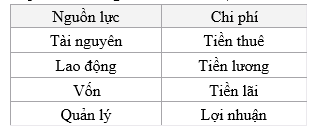 Có bốn nhóm nguồn lực: tài nguyên, lao động, vốn và quản lý. Chi phí cho các nguồn lực như sau: