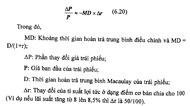 Sự thay đổi giá của ừái phiếu không thu hồi sẽ biến đổi tỷ lệ với thời gian hoàn trả trung bình điều chỉnh trong khoảng thay đổi ti suất lợi tức nhỏ. Cụ thể, phần trăm thay đổi giá trái phiếu bằng phần trăm thay đổi ti suất lợi tức nhân với thời gian hoàn trả trung bình điều chỉnh: