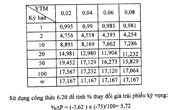 Ví dụ 6.19: Xem xét 1 trái phiếu với thời gian hoàn trả trung bình Macaulay D là 8 năm và r là 10%. Giả sử nhà đầu tư kỳ vọng YTM giảm 75 điểm cơ bàn (ví dụ YTM giảm từ 10% xuống còn 9,25%). Bước đầu tiên là tính thời gian hoàn trả điều chinh trung binh của trái phiếu nhu sau: