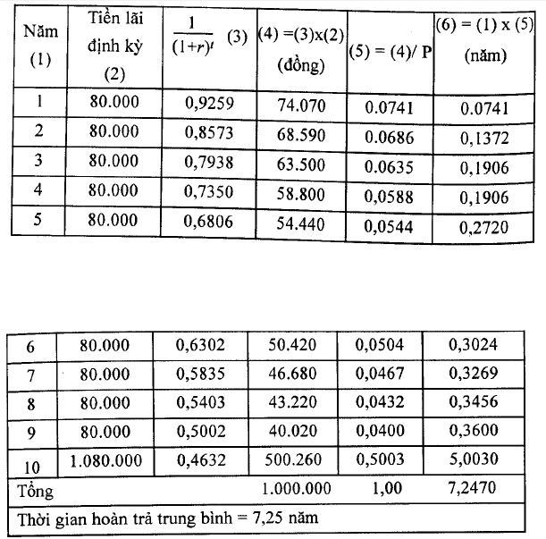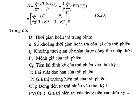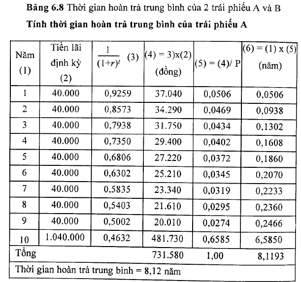 Tiền lãi trái phiếu được thanh toán hằng năm và lãi suất đáo hạn trái phiếu của trái phiếu A và trái phiếu B đều là 8%/năm, khoảng thời gian được tính toán như bàng 6.8. Thời gian hoàn trả trung bình được tính toán bằng việc sử dụng lãi suất đáo hạn trái phiếu (YTM) để chiêt khâu các dòng tiền của trái phiếu được gọi là thời gian hoàn trả trung bình Macaulay.