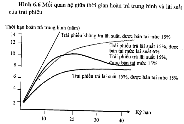 Ví dụ trong bảng 6.8 cho thấy nếu tỷ suất lợi tức tăng từ 8%/năm lên 12%/năm, khoảng thời gian hoàn trả của trái phiếu 4%/năm sẽ thay đổi từ 8,12 năm xuổng còn 7,75 năm, và khoảng thời gian của trái phiếu 8%/năm sẽ giảm từ 7,25 còn 6,68 năm. Tác động kép của những mối quan hệ ngược chiều giữa khoảng thời gian vái cả lẫi suất và tỷ suất lợi tức có thể biểu diễn bởi đường c ở hình 6.6.