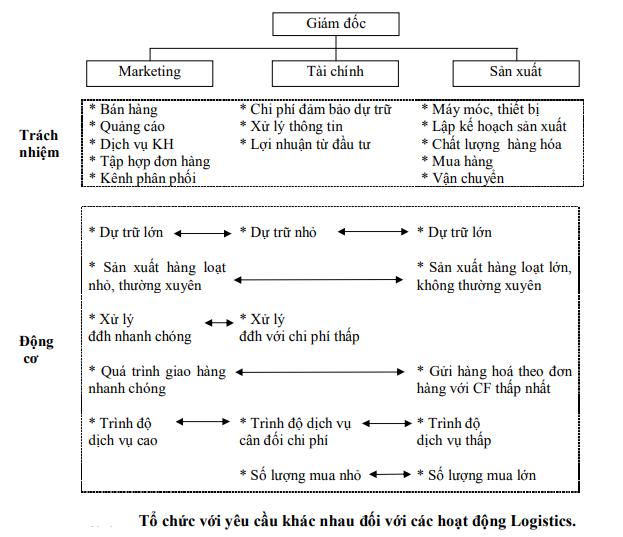 Theo quan điểm Logistics, sự sắp xếp này là do phân tán các hoạt động Logistics vào trong 3 chức năng với mục đích chủ yếu có phần nào khác với Logistics. Điều này có nghĩa, trách nhiệm vận chuyển có thể bị coi nhẹ, dự trữ bị phân tán ở 3 chức năng, và quá trình cung ứng (thực hiện đơn đặt hàng) hàng hoá cho khách hàng xếp sau marketing hoặc tài chính. Tuy nhiên, trách nhiệm chủ yếu của marketing có thể là tối đa hoá doanh thu, của nghiệp vụ có thể là giảm đến mức thấp nhất chi phí bình quân, còn của tài chính có thể là tối đa hoá chi phí vốn sao cho tối đa hoá mức thu hồi đầu tư của doanh nghiệp. Tuy nhiên, những mâu thuẫnvề mục đích có thể làm cho hệ thống Logistics hoạt động dưới mức tối ưu, và do đó hiệu quả kinh doanh của doanh nghiệp bị giảm sút. Ví dụ, marketing có thể yêu cầu cung ứng nhanh để hỗ trợ cho bán, trong khi đó các hoạt động nghiệp vụ lại mong muốn chi phí vận chuyển thấp nhất. Trừ phi có sự phối hợp chặt chẽ giữa các tuyến chức năng, còn trong đa số mọi trường hợp, không đảm bảo được sự cân đối chi phí- dịch vụ Logistics. Như vậy cần thiết phải có cấu trúc tổ chức để phối hợp các hoạt động Logistics phân tán.
