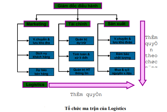 Trong tổ chức ma trận, nhà quản trị Logistics có trách nhiệm đối với toàn bộ hệ thống Logistics, nhưng không có quyền lực trực tiếp đối với các hoạt động từng phần. Cấu trúc tổ chức truyền thống của doanh nghiệp vẫn giữ nguyên. Nhà quản trị Logistics chia sẻ quyền quyết định và giải quyết các vấn đề với nhà quản trị khu vực hoạt động. Chi phí cho các hoạt động phải được điều chỉnh bởi mỗi phòng chức năng cũng như mỗi chương trình Logistics, đay là cơ sở để hiệp tác và phối hợp. Tuy tổ chức ma trận có thể là hình thức tổ chức hữu ích, nhưng chúng ta cũng nhận ra rằng, tuyến quyền lực và trách nhiệm trở nên không rõ ràng. Những mâu thuẫn có thể xuất hiện không dễ giải quyết. Tuy nhiên, đối với một số DN, cách lựa chọn này là sự dung hoà giữa hình thức hoàn toàn không chính tắc và hình thức cấu trúc bậc cao.