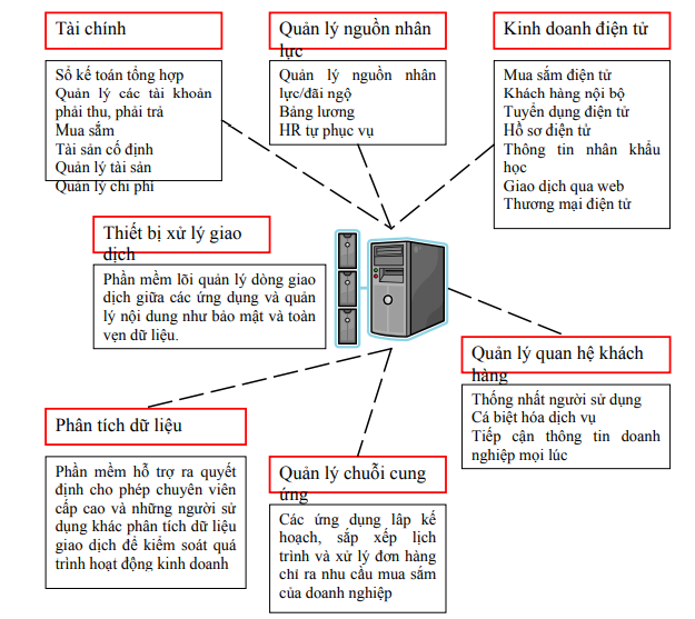 Trên thực tế, khái niệm ERP theo chuẩn quốc tế giới hạn trong phạm vi hoạch định tổng thể các nguồn lực doanh nghiệp, các nguồn lực ở đây bao gồm nhân lực (con người), vật lực (tài sản, thiết bị…) và tài lực (tài chính). Khối lượng công việc trong hoạch định và sử dụng các nguồn lực của doanh nghiệp chiếm phần lớn trong toàn bộ hoạt động của doanh nghiệp nên ERP là hệ thống phần mềm rất lớn. Các chức năng cơ bản của ERP gồm: Quản trị nhân lực, quản trị tài chính, quản trị sản xuất, quản trị nguồn cung, quản trị hoạt động kinh doanh, quản trị quan hệ khách hàng.
