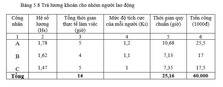 Ví dụ, sau khi giám định mức độ hư hỏng của một chiếc máy tiện, phân xưởng khoán cho ba công nhân thực hiện với tổng số tiền thù lao là 60.000 đồng. Ba người thợ sửa chữa trong nhóm sẽ được trả lương tương ứng với các hệ số lương, thời gian làm việc thực tế và mức độ tích cực của mỗi người như trong trong bảng 5.8 dưới đây.