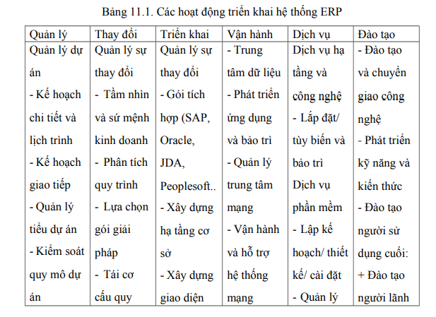 Từ mô hình trên ta thấy triển khai hệ thống ERP là một quá trình diễn ra liên tục, từ quản lý dự án, quản lý sự thay đổi, triển khai vận hành, dịch vụ hỗ trợ tới đào tạo và chuyển giao công nghệ. Đòi hỏi mọi nhân viên trong doanh nghiệp phải tham gia với sự phối hợp cao nhất để triển khai được hệ thống tổng thể cho doanh nghiệp.