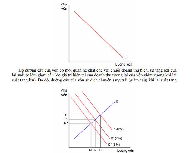 Với lãi suất đã cho, đường cầu vốn là giá trị hiện tại của chuỗi doanh thu biên của vốn tạo ra tại mỗi mức vốn cụ thể. Nếu các nguồn lực khác vẫn không đổi, doanh thu biên của vốn sẽ giảm xuống (trong mỗi thời kỳ). Vì vậy, chúng ta nhận thấy đường cầu của vốn là đường dốc xuống như trong biểu đồ dưới đây.
