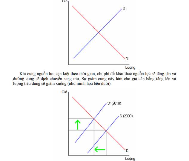 Cũng như những hàng hóa khác, giá và lượng cân bằng của nguồn lực không thể tái tạo được xác định thông qua sự tương tác của cung cầu. Một lượng lớn nguồn lực cung cấp hôm nay khi giá cao hơn. Chẳng hạn, nhiều giếng dầu mỏ sẽ bị khoan khi giá dầu tăng lên. Cho dầu các doanh nghiệp chuyển sang sử dụng nguồn nhiên liệu khác thì khi đó lượng cầu giảm xuống cũng sẽ làm cho giá dầu tăng lên. Điều này có thể minh họa trong biểu đồ dưới đây.