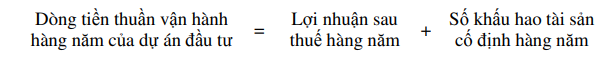 - Dòng tiền thuần vận hành được xác định là số chênh lệch giữa lượng tiền thu được (dòng tiền vào) và lượng tiền chi ra (dòng tiền ra) phát sinh từ hoạt đông thường xuyên trong kỳ khi dự án được đưa vào vận hành (đưa vào hoạt đông kinh doanh). Đối với dự án đau tư trong kinh doanh tạo ra doanh thu tiêu thụ sản phẩm hoặc lao vụ thì thu nhập từ hoạt đông hàng năm hay dòng tiền thuan vận hành của dự án có thể được xác định bằng doanh thu thuan trừ đi chi phí hoạt đông thường xuyên ( không kể khấu hao TSCĐ) và thuế thu nhập doanh nghiệp. Điều đó cũng có, nghĩa là thu nhập từ hoạt đông hay dòng tiền thuan hàng năm của dự án có thể xác định bằng công thức sau: